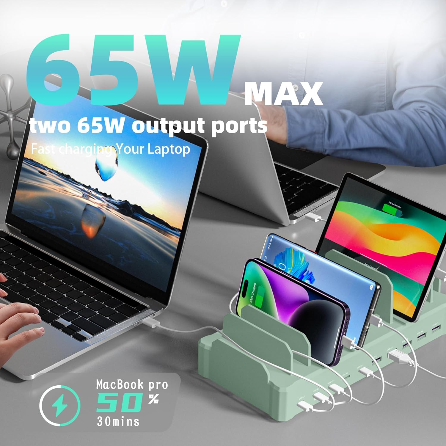 Fast GaN Charging Dock: This multi device charging station equips PD ports for apple devices, to power your smart gadgets with high speed. You can charge your laptops like Macbook series with the top two 20V/3.25A fast charging power. Additionally, three 30W ports and five 20W ports make it perfect for fast charging iPhones, Galaxy S23/Ultra, headphones, Kindles, iWatches, Switches, and more, meeting all your daily charging needs.