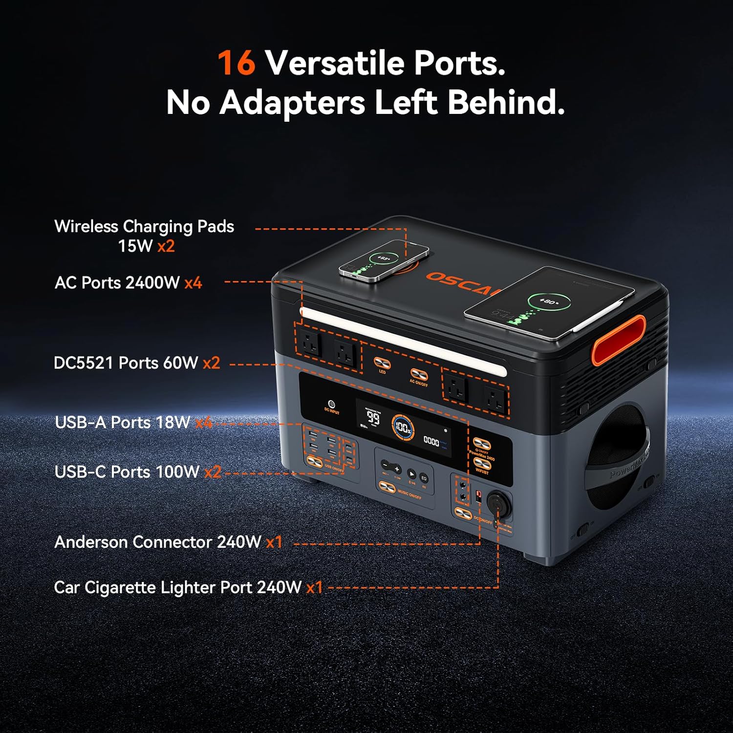 🔌【16 rich interfaces, meet 99% of the scene requirements.】 The OSCAL Powermax 2400Pro features: 4 x AC outlets, 2 x USB-C PD 100W ports, 2 x wireless charging pads, 2 x DC outputs, 1 x cigarette lighter socket, 4 x USB-A ports, 1 x Anderson connector Whether for a temporary outdoor workspace or as an emergency power supply for homes and businesses, it offers comprehensive coverage without complex adapters.