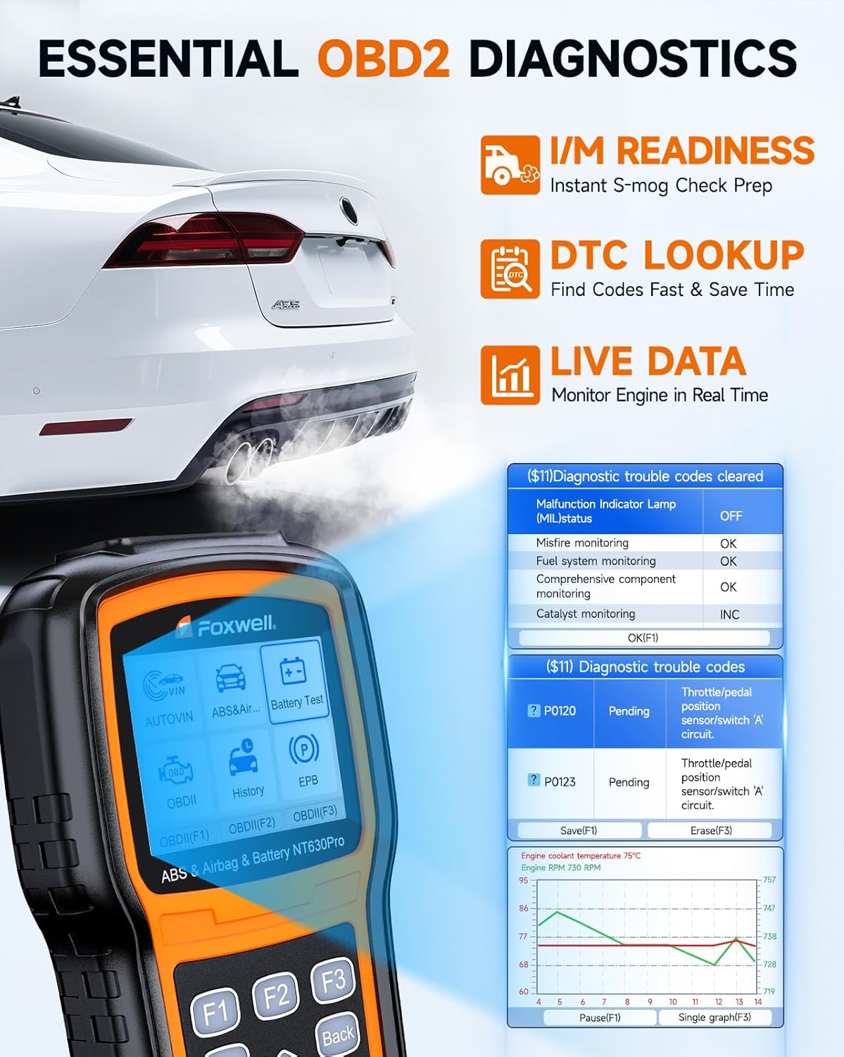 UPGRADED 2-IN-1 SCAN & BATTERY TOOL – Building on the trusted FOXWELL NT630 Plus, the upgraded NT630 Pro takes diagnostics further with an integrated 12V Battery Tester & Battery Registration (BRT). Now you can scan ABS, SRS, and OBD2 faults and test battery health, cranking, and charging — all in one professional tool. One purchase replaces two separate devices, saving both cost and time.
