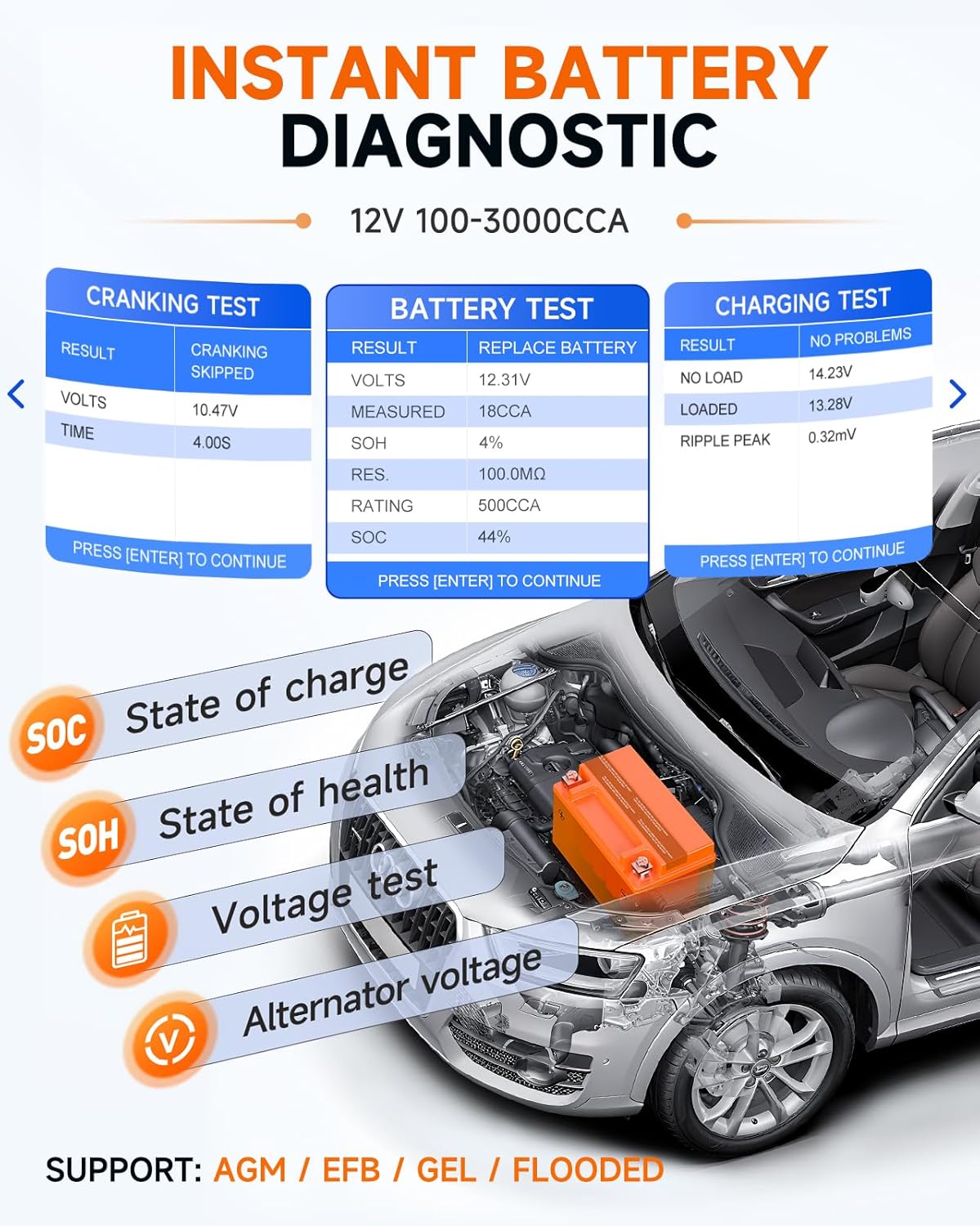 COMPLETE BATTERY STATUS ANALYSIS – Professional 12V automotive battery analyzer, not just voltage reading. This obd2 scanner diagnostic tool adds same full test as FOXWELL BT301: battery health, cranking, and charging tests for Regular/AGM/EFB/GEL (100–3000 CCA). Works as a reliable car battery load tester to show SOH, SOC, internal resistance, cranking voltage and alternator status, with results displayed clearly on a bright 2.8″ color screen. Quickly spot weak batteries in cars, SUVs, RVs, boats and marine to prevent breakdowns.