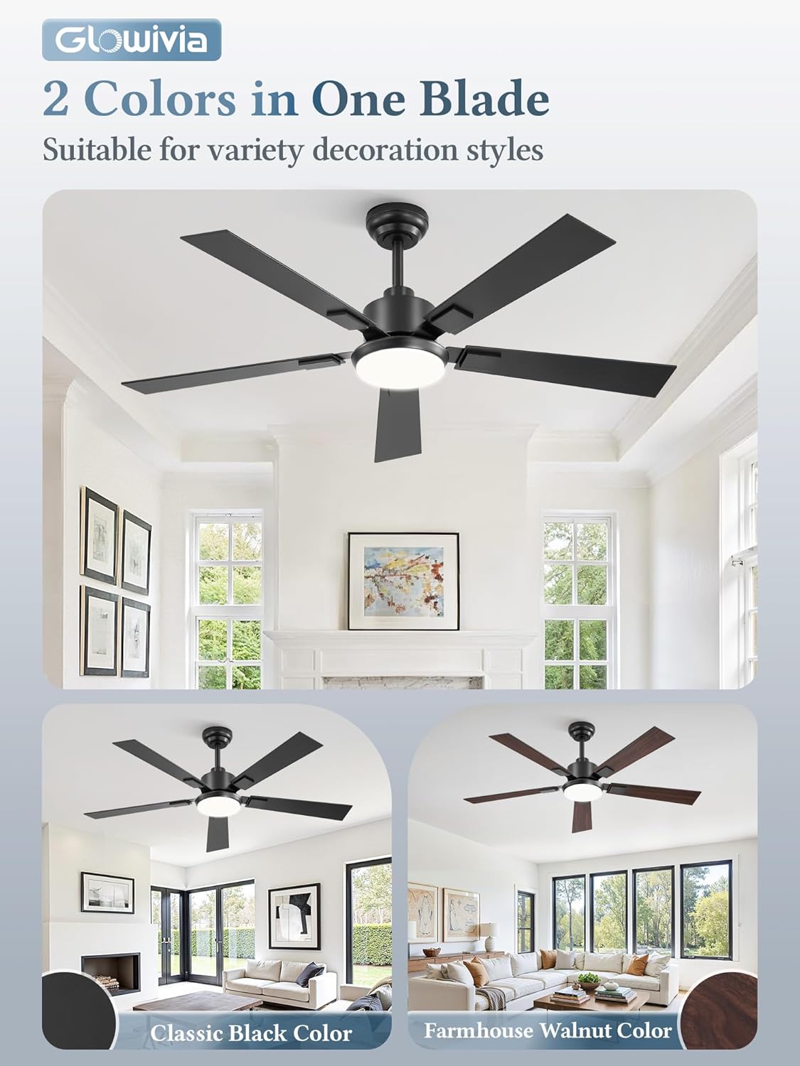52 Inch Ceiling Fan: The living room ceiling fan features reversible blades—a classic black finish on one side and a walnut tone on the other. This design is perfect for modern or farmhouse-style interiors. With a 52-inch diameter, the modern ceiling fan is ideal for rooms up to 10ft.×20ft, including bedrooms, living rooms, covered patios and porches(Not to expose to rain directly)