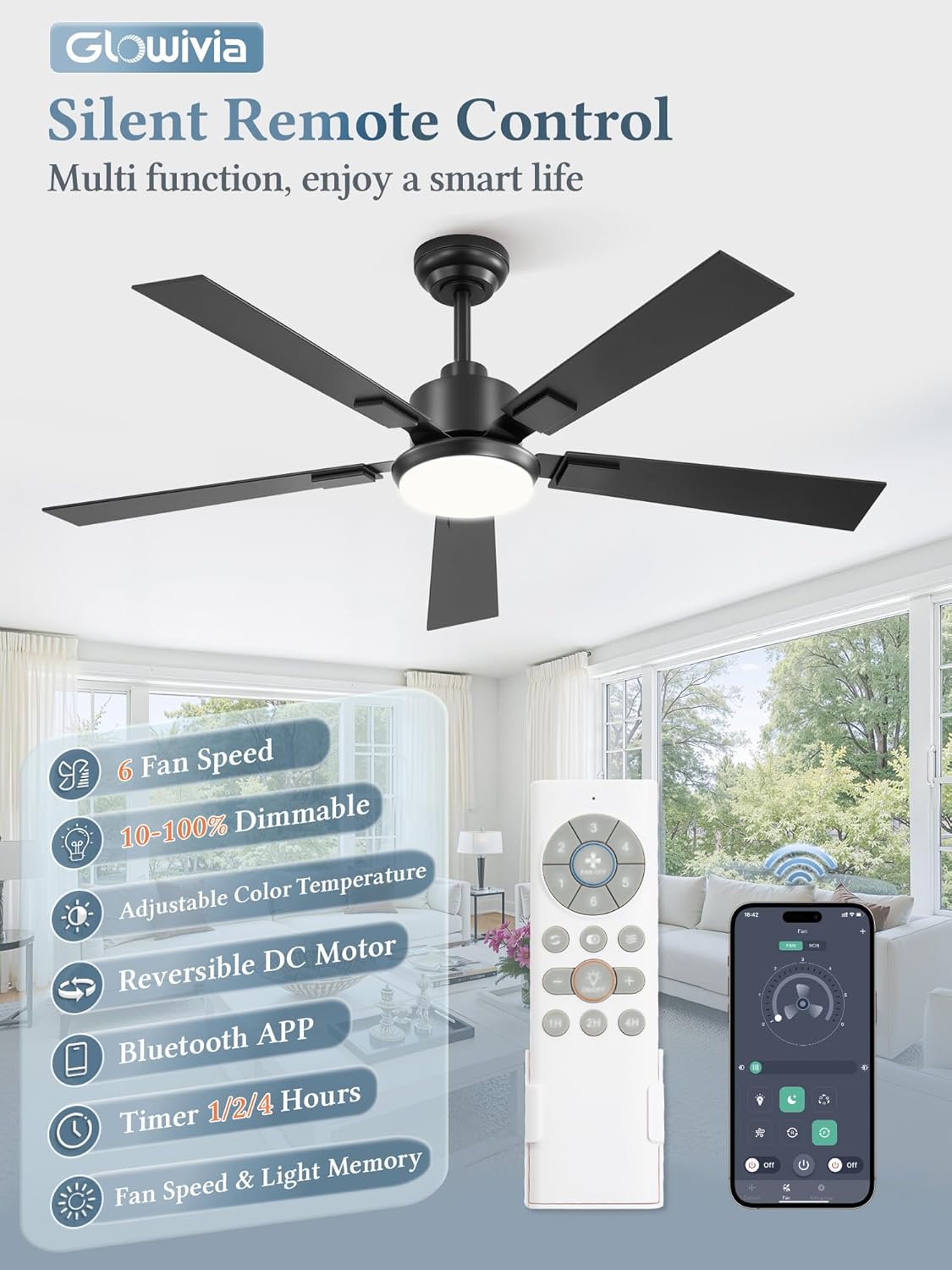 This 52-inch ceiling fan strikes a great balance between modern convenience and solid performance. The combination of remote control and app control makes it incredibly easy to adjust on the fly—brightness, color temperature from 3000K to 6000K, and all six fan speeds respond instantly. The light output is impressive, and the motor runs so quietly you almost forget it’s on… until you feel that smooth, steady airflow.What really wins me over is the reversible motor and how seamlessly it fits into a contemporary space. It cools efficiently in summer and helps circulate warm air in winter, making it useful year-round. Sleek, silent, and smart—this fan doesn’t try to be flashy; it simply works beautifully, and that’s exactly what makes it worth having.