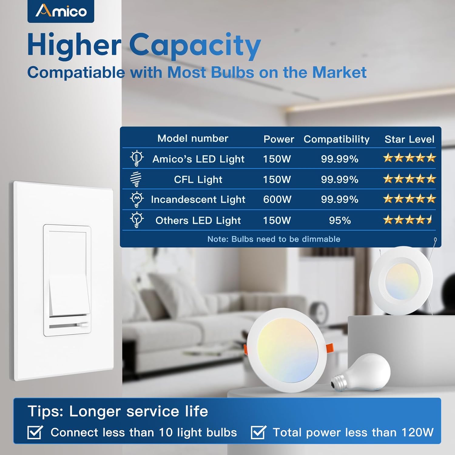 The Amico Dimmer Light Switch delivers smooth, reliable dimming performance in a sleek ivory package. Whether you’re upgrading your lighting ambiance or just trying to tame those bright LEDs, this single-pole/3-way switch gets the job done with no fuss.✅ What I Liked:Versatile Setup – Works as both a single-pole and 3-way dimmer, so it’s compatible with most common wiring setups.Smooth Sliding Control – The dimmer slider moves smoothly and feels durable—not loose or cheap like some others.LED/CFL + Incandescent Compatible – Handles up to 150W of dimmable LED/CFL or 600W of incandescent/halogen, giving flexibility across bulb types.Wall Plate Included – Bonus points for including the matching ivory wall plate. No extra trip to the hardware store!Clean, Neutral Aesthetic – The ivory finish looks sharp and blends easily into most walls and decor.⚠️ Things to Consider:Not Smart-Home Compatible – No Wi-Fi or app control here. Strictly old-school manual operation.Slight Buzz With Some Bulbs – Depending on your bulb brand/model, you might hear a faint hum at low dimming levels (common with many dimmers).💬 Final Verdict:The Amico Dimmer Switch is a dependable, no-frills lighting upgrade that works seamlessly with both modern and traditional bulbs. It installs easily, dims reliably, and feels built to last—all at a wallet-friendly price.Rating: ⭐⭐⭐⭐☆ (4/5)Simple, effective, and stylish—perfect for anyone looking to modernize their lighting without going fully smart.