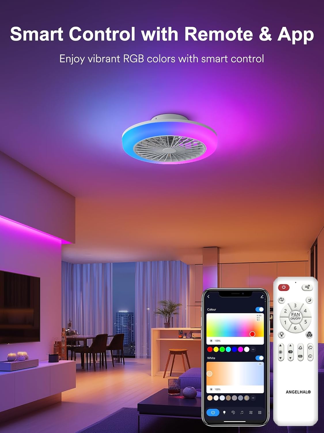 7 reviews for ANGELHALO 18″ Smart Ceiling Fan with Light, RGBWW Flush Mount Fandelier with Remote/App Control, Music Sync, Quiet 6-Speed Motor, Low Profile for Bedroom/Kids Room/Home Offices/Small Living Spaces
