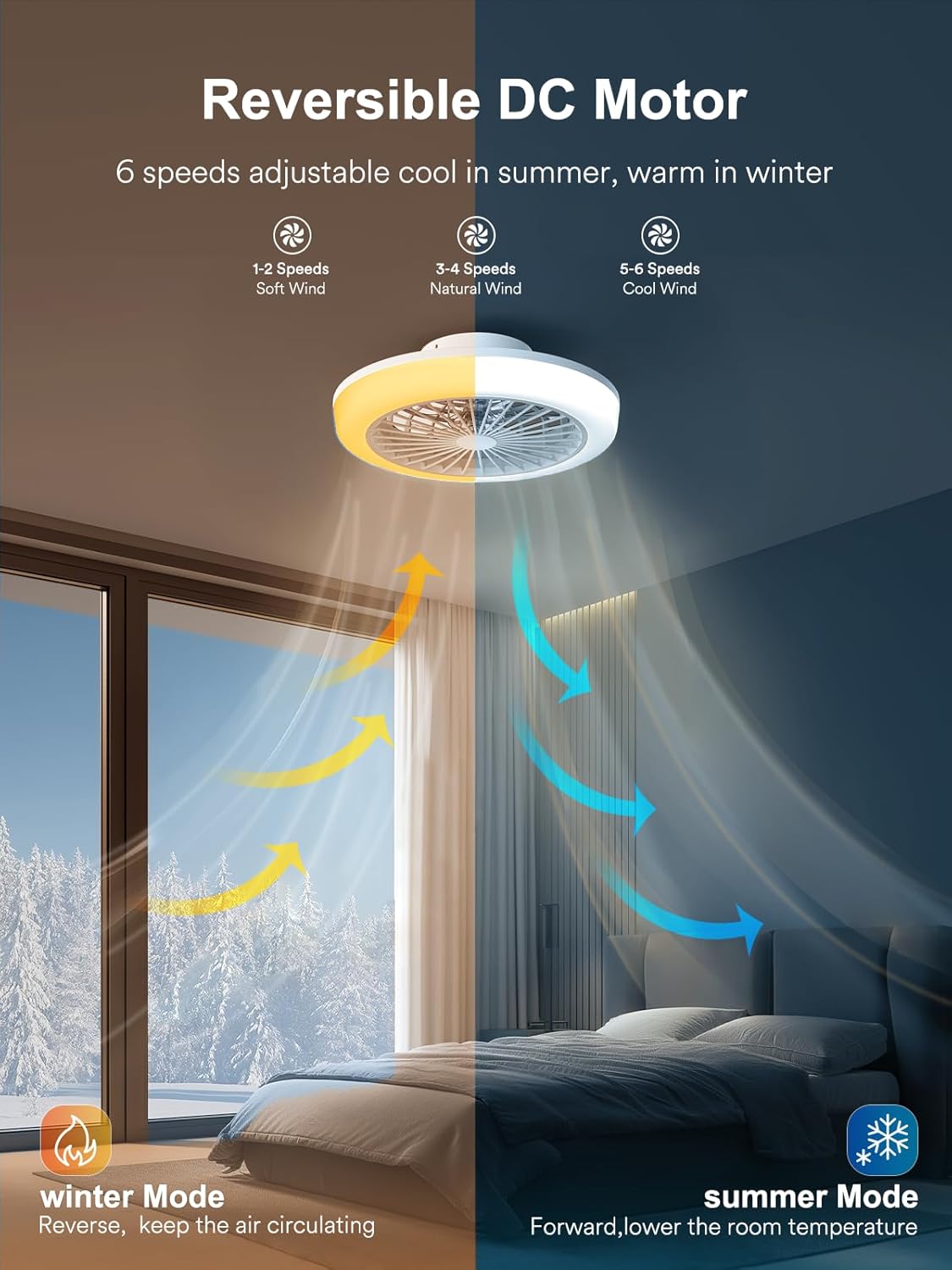 Reversible DC Motor & Quiet Operation: The upgraded DC motor provides strong airflow with two reversible modes—cooling downdraft for summer and warming updraft for winter. Built with a pure copper motor, this ceiling fan operates smoothly and quietly, making it ideal for any room.
