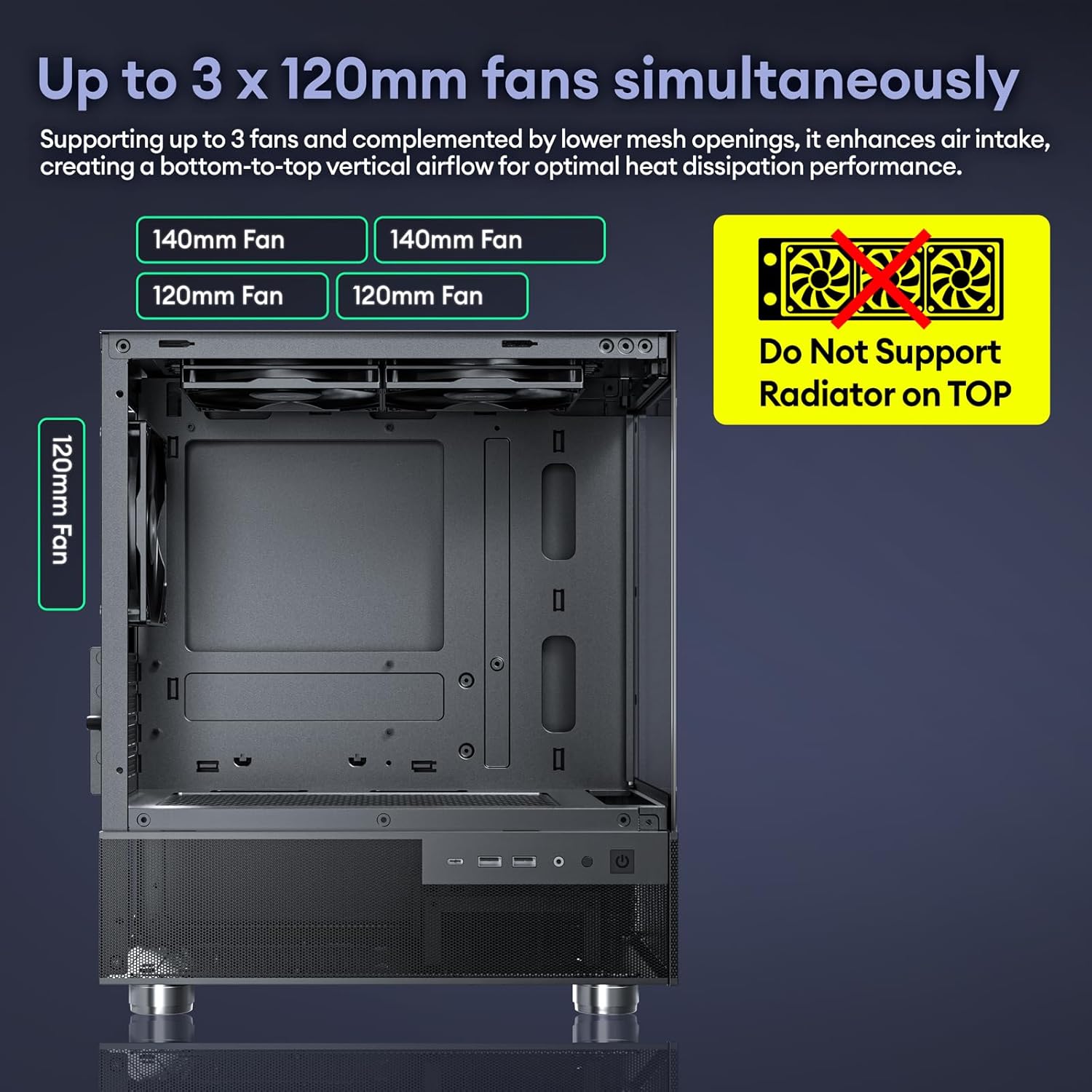 【Vertical Airflow Design with 2 × H12 Non-PWM Fans (No ARGB) at the Top and 1 × H12 Non-PWM Fan (No ARGB) at the Rear】 Equipped with 2 × H12 Non-PWM fans (No ARGB) at the top of the case, it achieves a meticulously designed vertical airflow path to ensure efficient cooling. Additionally, there is 1 × H12 Non-PWM fan(No ARGB) at the rear of the case to enhance airflow. With this meticulous airflow engineering, it guarantees optimal cooling performance;