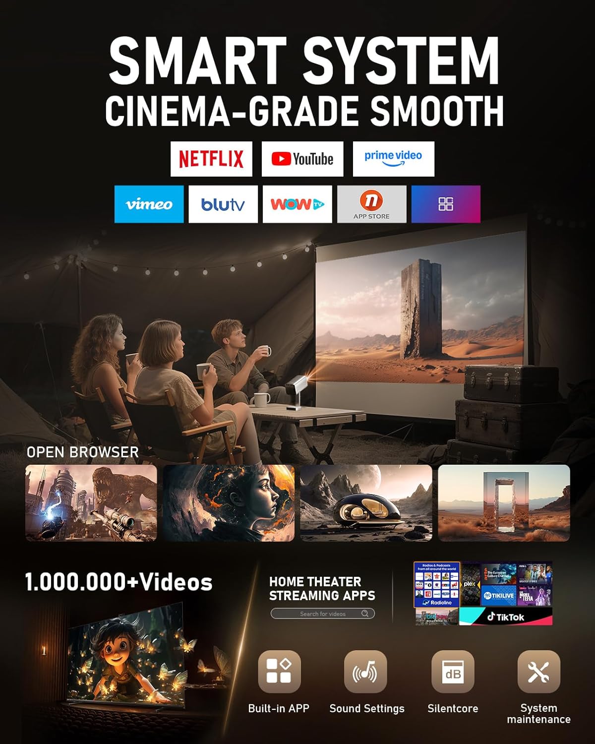 [Smart Projector with Officially-Licensed APP– Stream Anywhere] – This projector compatible with Netflix comes with built-in streaming apps for the ultimate convenience. Whether you’re enjoying a cozy night in bed or camping under the stars, just a tap lets you stream thousands of movies and shows from Netflix, Prime Video, YouTube, and more. With smooth performance, vivid visuals, and reliable stability, this video projector brings the big-screen experience to any place, anytime.