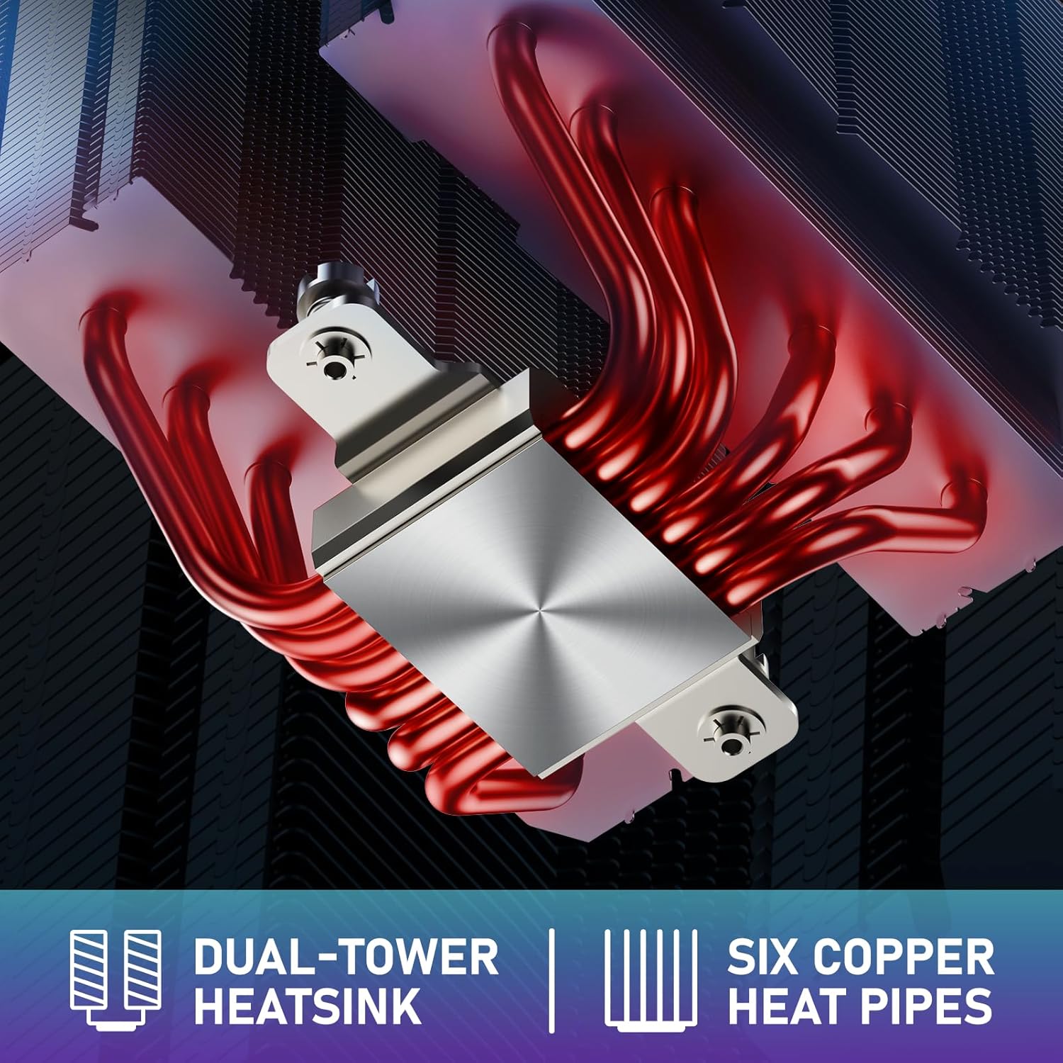 Fast Heat Dissipation: The CPU cooler consists of a dual-tower heatsink and dual fans. Equipped with 6 pure copper heat pipes and a pure copper base that can make good contact with the CPU to conduct heat effectively, along with a 2000RPM high-speed ARGB fan, which can easily dissipation the CPU temperature and further improve the heat dissipation efficiency of the cooler.
