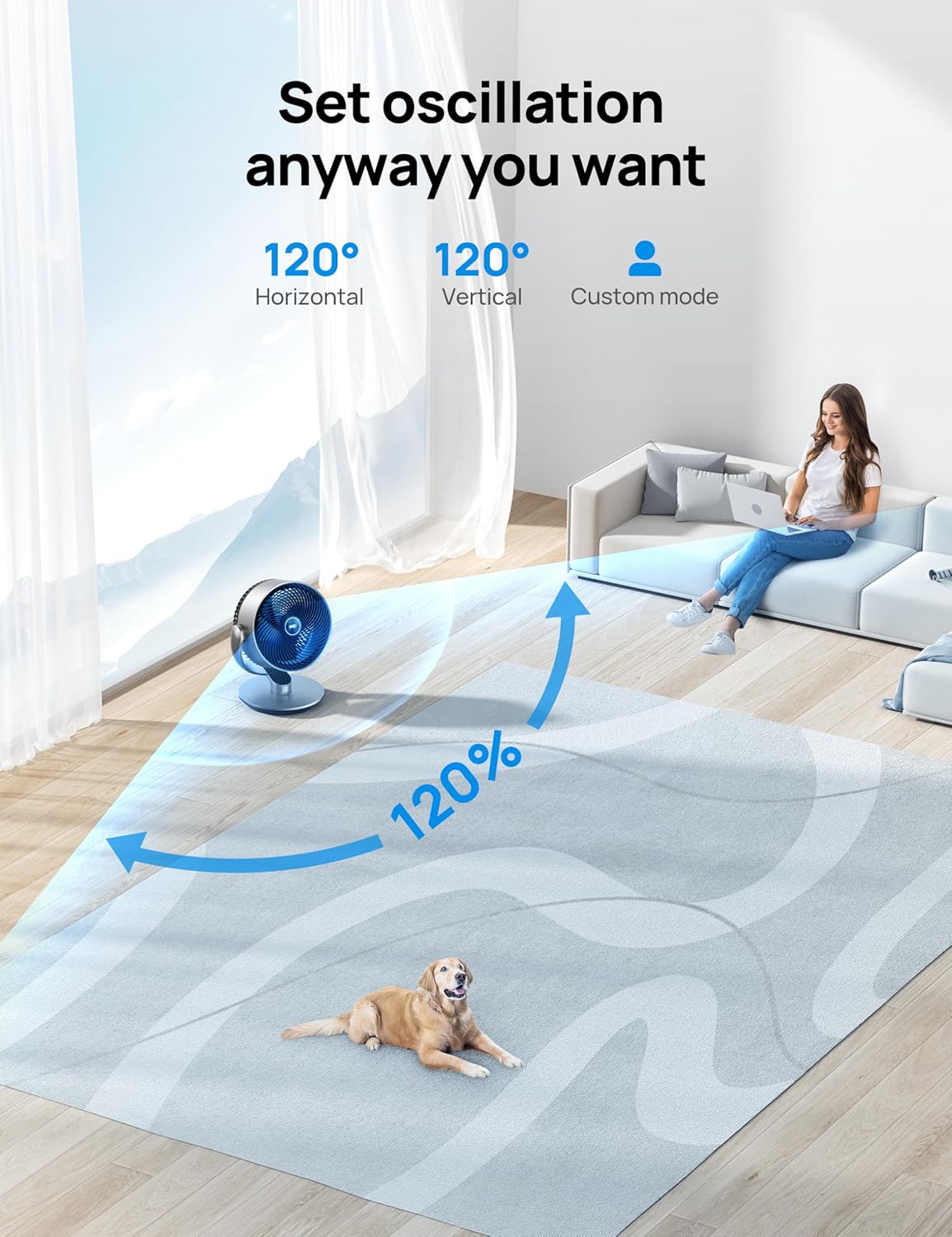 Cool every spot : Feel the air all around with this oscillating fan. The multi-directional 120° vertical and 120° horizontal oscillation let you direct air wherever you want, and the Dreo app lets you tweak the angle as you like, making it perfect for any use.