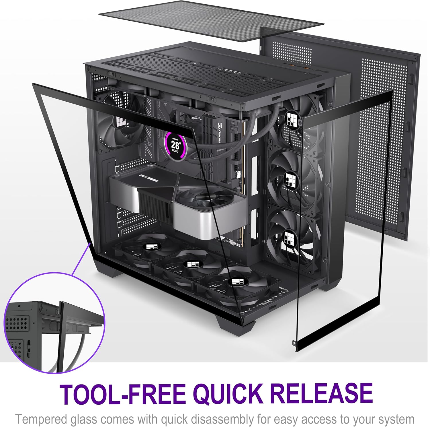 【270° Panoramic Dual Cabin Design】The FOIFKIN F300(2025) PC case adopts a sleek and modern design, consisting of a 270° panoramic tempered glass panel for a wider field of vision. The design of the fully transparent glass curtain wall provides a high-quality display platform for your high-end hardware components. The tempered glass has good sound insulation, provides great comfort for office/gaming environments, requires no tools and is easy to disassemble.