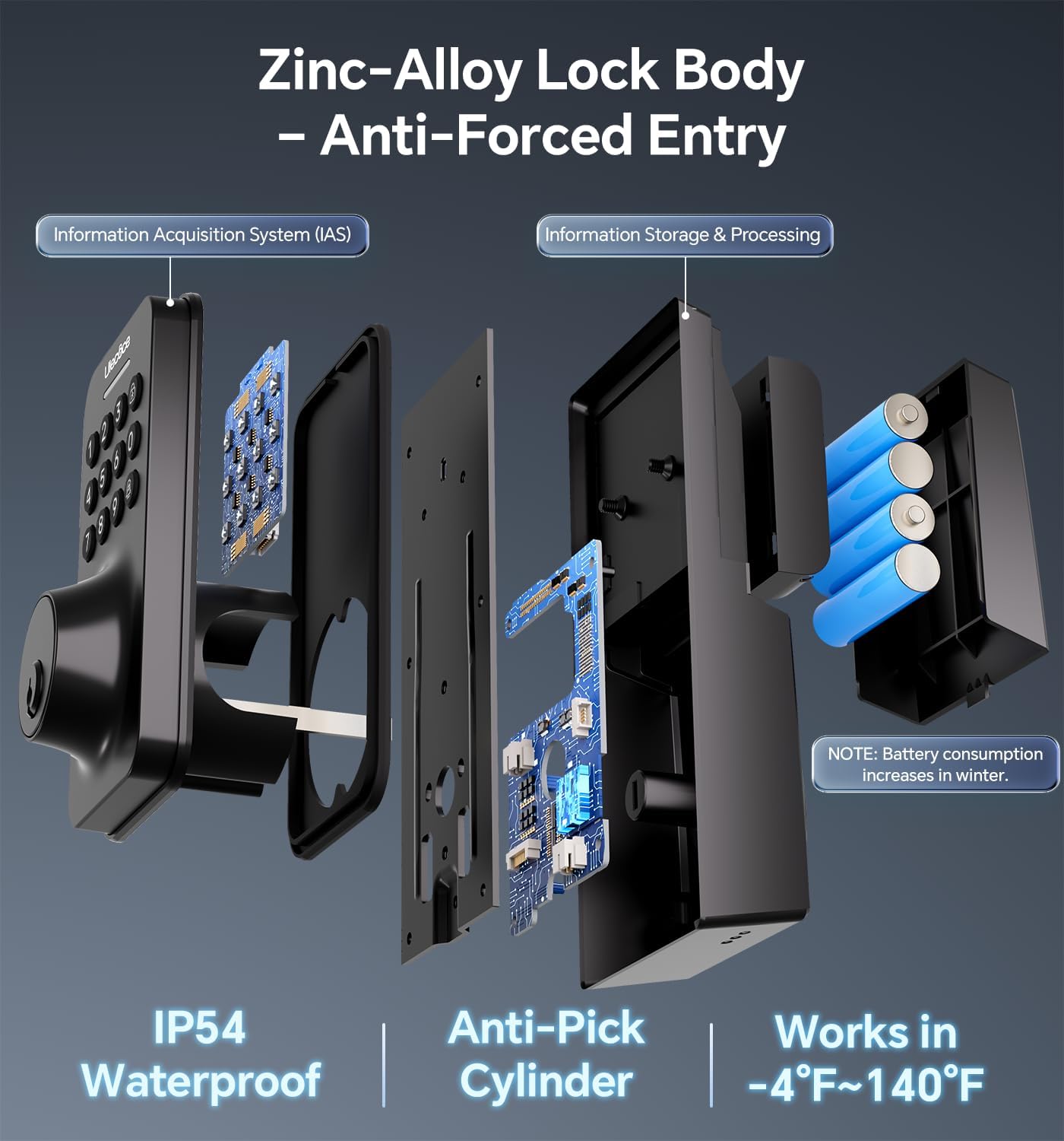 ANSI/BHMA Grade 3 Security Protection: This keyless entry door lock features anti-peek virtual codes (blocks shoulder surfing) and a 5-wrong-attempt lockout. It also adds a Type-C port—works with power banks to prevent lockouts during vacations or power outages—providing all-round protection for families, offices, and renters.