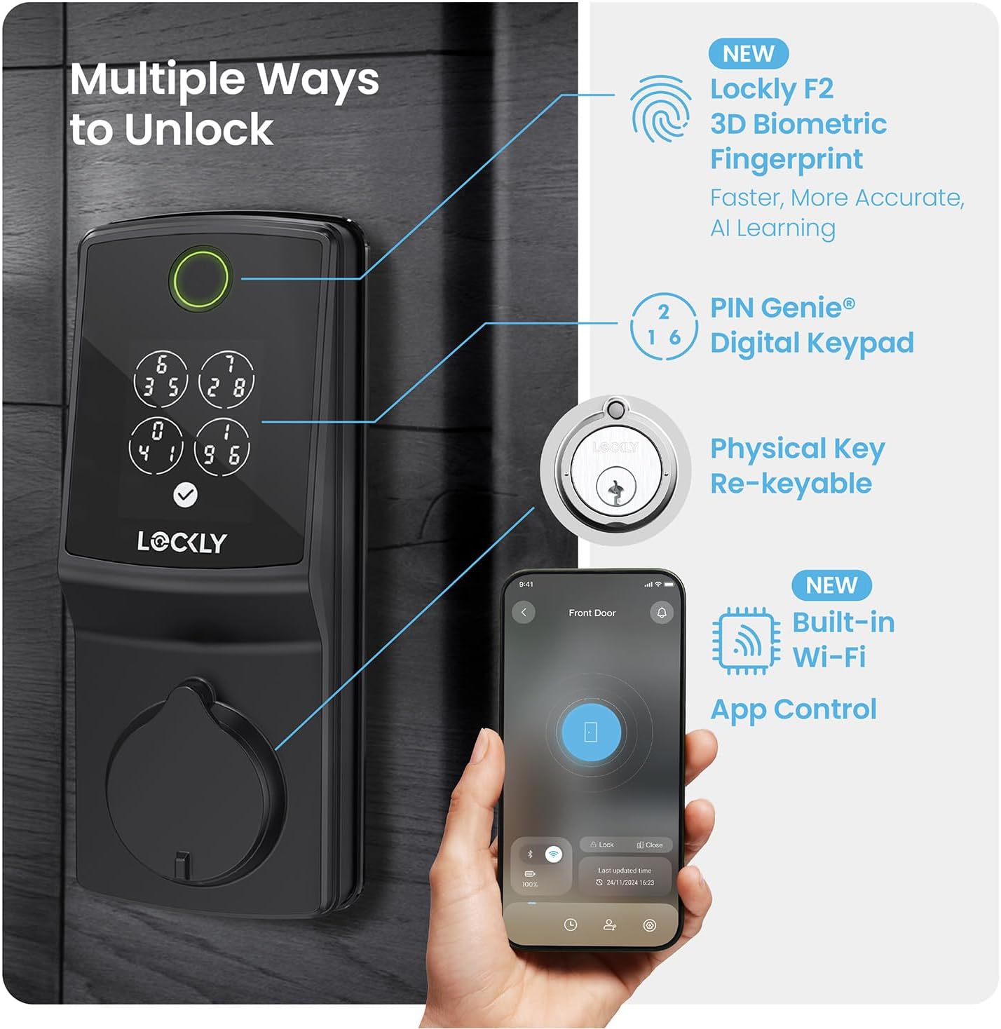 Built-In Wi-Fi + 98% Faster Remote Access: Unlike earlier models, the 2025 Secure Pro has Wi-Fi built in — no hub required. This means +98% faster remote access compared to previous versions. Use the Lockly App to monitor activity, lock/unlock from anywhere, share eKeys, eBadges, or Offline Codes, and manage multiple devices easily with Air Transfer.
