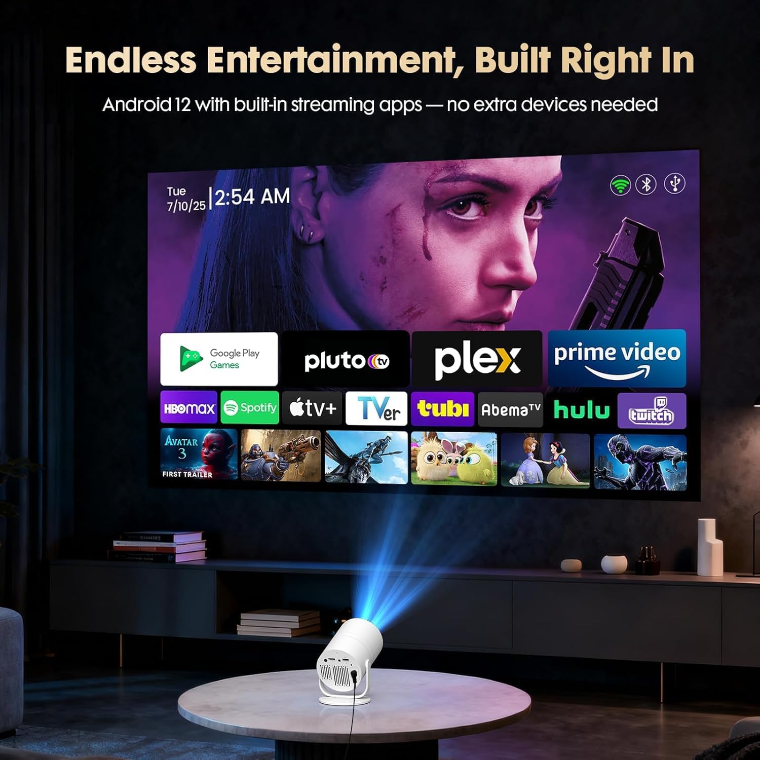 [Mini Projector with Android 12] Powered by the latest Android 12, this projector lets you access thousands of apps like Netflix, YouTube, and Prime Video without any external devices. Enjoy faster performance, smoother streaming, and smarter control all in one compact projector