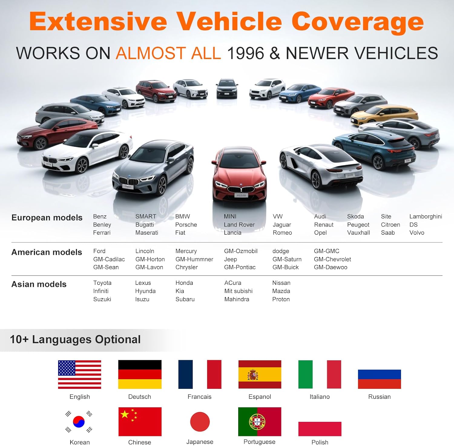 [Check Compatibility Before You Buy] WIDELY USAGE: This advanced OBD2 scanner diagnostic tool is designed for almost all vehicles & light trucks & SUVs after 1996 sold in us, and cars & light trucks after 2002 EU and after 2008 Asian. And compatible smoothly with KWP2000, ISO9141, J1850 VPW, J1850 PWM, and CAN all OBDII protocols. But Feature compatibility varies by vehicle make, model year, and VIN. [Before purchasing, please verify compatibility]. It supports more than 10 languages like English, Spanish, and French… enabling you easily switch to your local language, enjoy an intuitive and friendly diagnostic experience.