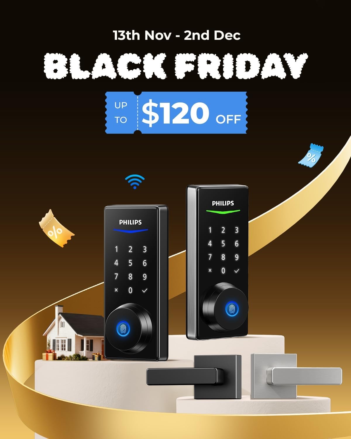 Connect to WiFi, Control from Anywhere (𝐏𝐡𝐢𝐥𝐢𝐩𝐬 𝐖𝐢𝐅𝐢 𝐆𝐚𝐭𝐞𝐰𝐚𝐲 𝐈𝐧𝐜𝐥𝐮𝐝𝐞𝐝): Easily connect your Smart Deadbolt Lock to the WiFi via Philips WiFi Gateway(included), allowing you to remotely lock/unlock your door, monitor access in real time, and receive instant notifications—all from your smartphone. Enjoy peace of mind with seamless smart security wherever you go.