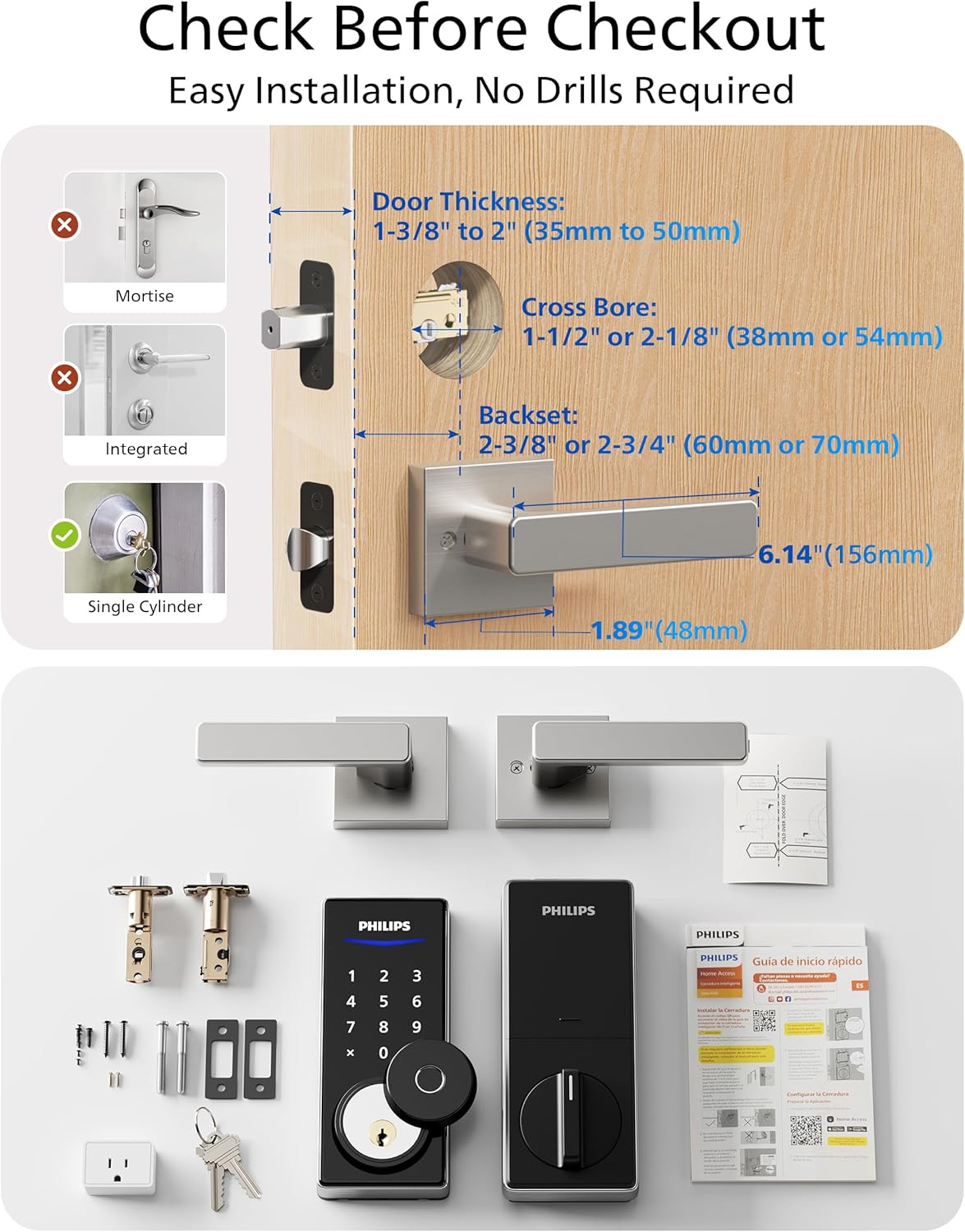Easy Installation and Wide Compatibility: You can finish the installation in just 15 minutes with only a screwdriver. It is suitable for both left-handed and right-handed doors, making it an ideal choice for garage doors, side doors, office doors, or basement doors. Please check if it is compatible with your door before purchasing. The Philips smart lock makes your life more convenient.