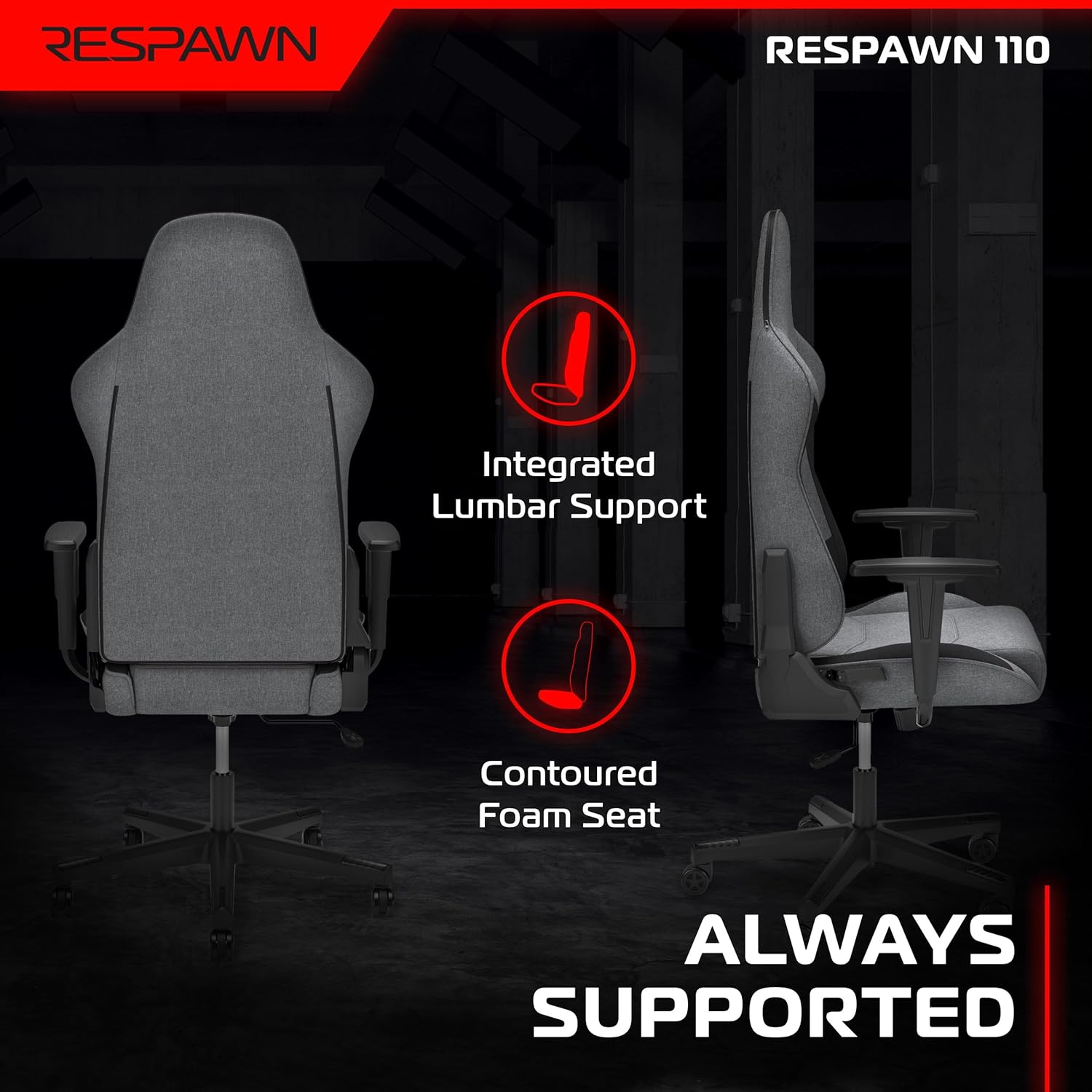 Respawn 110 Ergonomic Gaming Chair – Reclining Office Video Game Swivel Chair with Lumbar Support, Headrest, Heavy Duty, High Back, Racing Style Gaming Recliner Seat for Computer Gamer – Gray Fabric
