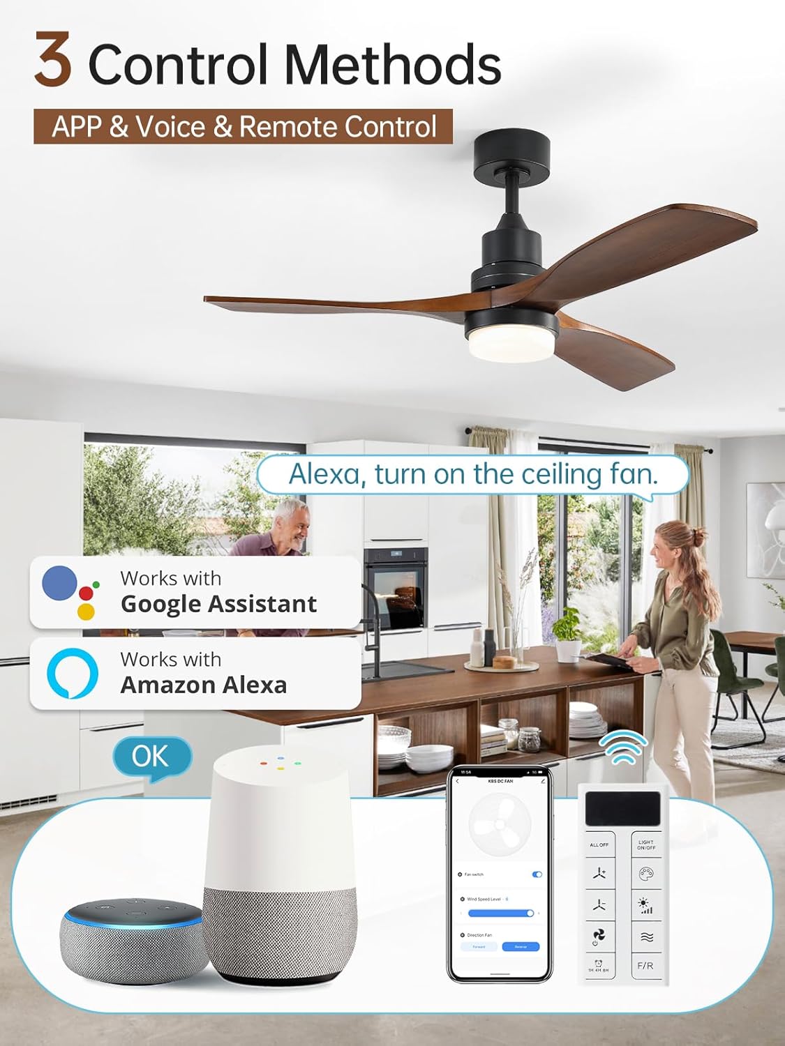 Voice & App & Remote Control: Sofucor smart ceiling fan with light can be controlled in 3 ways. The smart ceiling fan can be easily adjusted anytime and anywhere by mobile phone. Connect to Google Assistant and Alexa, you can free your hands with voice commands
