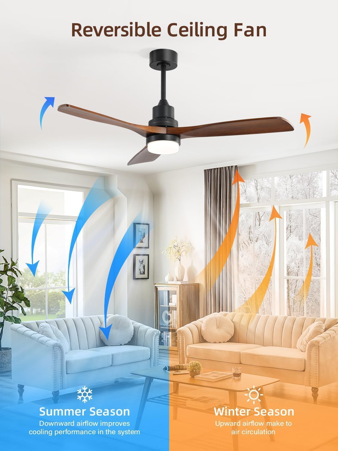 Year-Round Use: Sofucor modern smart ceiling fan spins forward in summer, creating a downward airflow that circulates air and dissipates heat. In winter, it spins in reverse to disperse warm air trapped near the ceiling, evenly distributing warmth and enhancing comfort