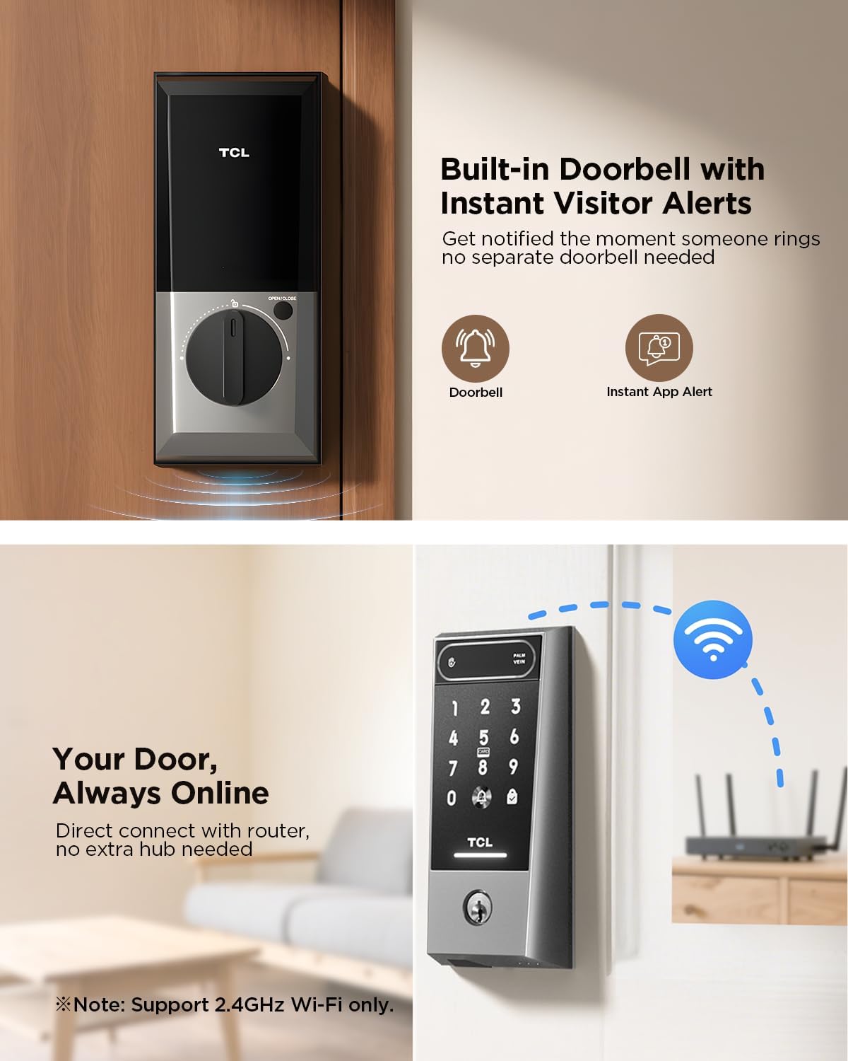 Real-Time Alerts & Remote Access: Get instant alerts on your smartphone anytime your door is unlocked. Grant access to family, guests, or delivery drivers from anywhere with the “TCL Home App”. Perfect for securely receiving packages or letting in guests while you’re away