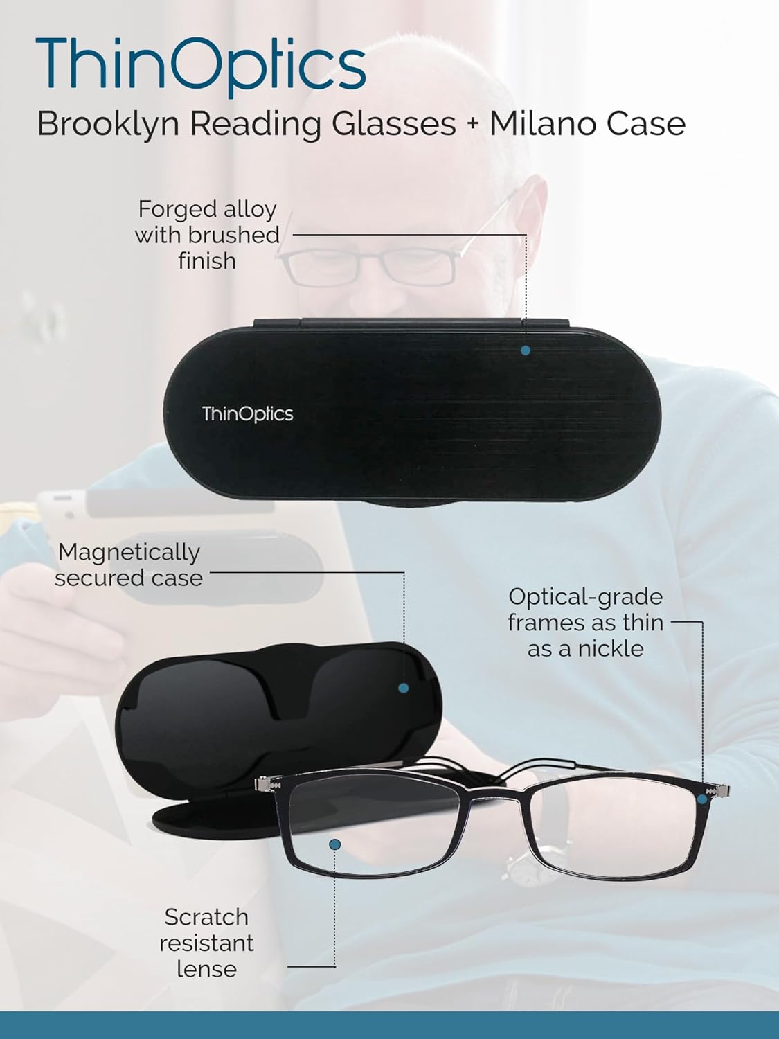 Weighing less than 2 sheets of paper, Frontpage Reading Glasses are feather-light, durable and ultra-thin. They fit so comfortably in the front pocket of your pants, you may forget they’re with you. Paired with a brushed aluminum, felt-lined 4mm case, they gracefully nest together for protection and portability. Frontpage are full-frame readers, which are a more familiar form factor, without the bulk, for people who have used reading glasses in the past. Both Frontpage styles fit in the felt-lined and magnetic Milano case, but will not fit in the other systems for ThinOptics Readers. Frontpage Reading Glasses are created from medical device materials, like Nitinol, the super-elastic metal alloy used for heart stents. Lenses are incredibly slim, and made from bulletproof-strong polycarbonate lenses. Yep, we don’t mess around. Top quality materials help make both styles light, comfy and durable.