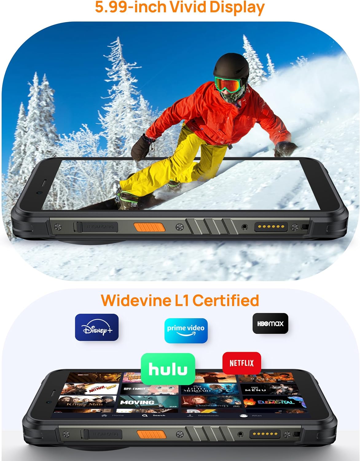 【5.99” HD+ Display】The 5.99″large screen is designed for comfortable, incredibly smooth viewing and natural interaction with all your content and apps. Dive into your social feeds, effortlessly navigate your favorite apps can be intuitive. Experience carefree phone use on any outdoor adventure! With 910 nits of max brightness, your screen remains perfectly clear and comfortable to view, even under direct sunlight.