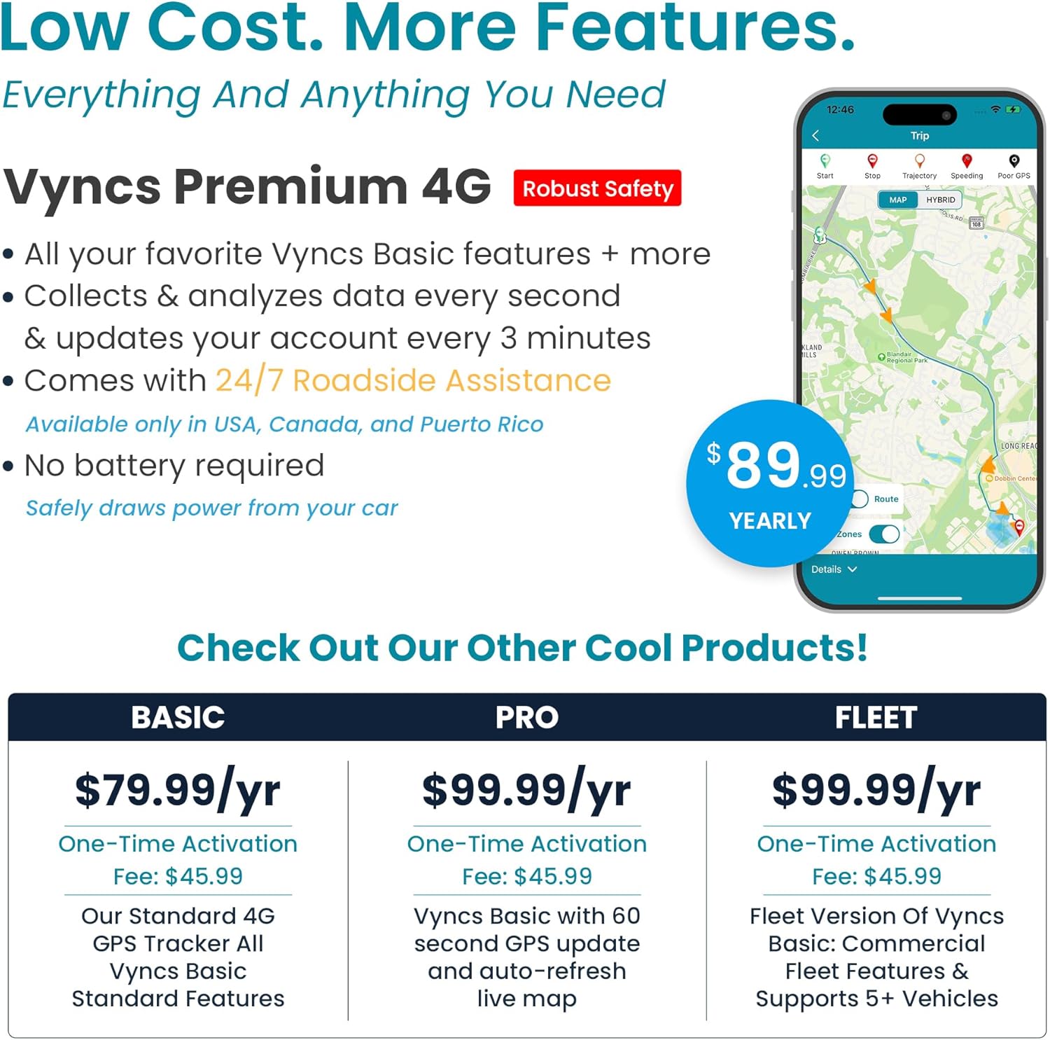 Customer for 5+ years. Provides reliable route/speed tracking, good for stealth watching teenage drivers and/or elderly relatives who are still driving. Web and Android interfaces are pretty klunky for setting up zones, but Ok once set up. Lots of negative comments concerning Customer Service, but I have not had a problem with email support as long as you watch the CS hours: THEY QUIT AT 3:00 PM Eastern TIme, be aware. Roadside Assistance has 3x/year and $100 cap, which is OK for minor problems, be aware, it’s not AAA service.I would change to a different service that is easier to configure and use, but Vyncs provides reliable LTE connection, and the price is Ok as long as you renew the service yearly to avoid the renewal fee.