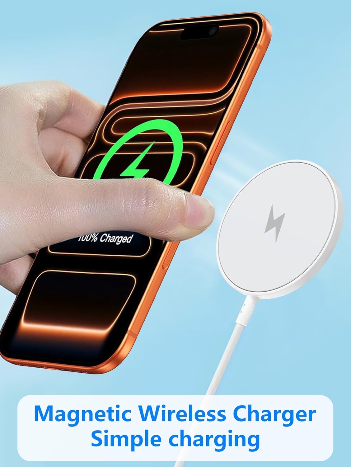 【Qi-Universal & AirPods Compatible: One Charger for All】: This versatile magnetic wireless charger works flawlessly with all Qi-enabled devices—including your iPhone wireless charger, Samsung Galaxy S24/S23/S22/S21, and more. It also powers up your AirPods Wireless Charging Case (1st/2nd/3rd/4th Gen & Pro 1/2/3), eliminating the clutter of multiple chargers